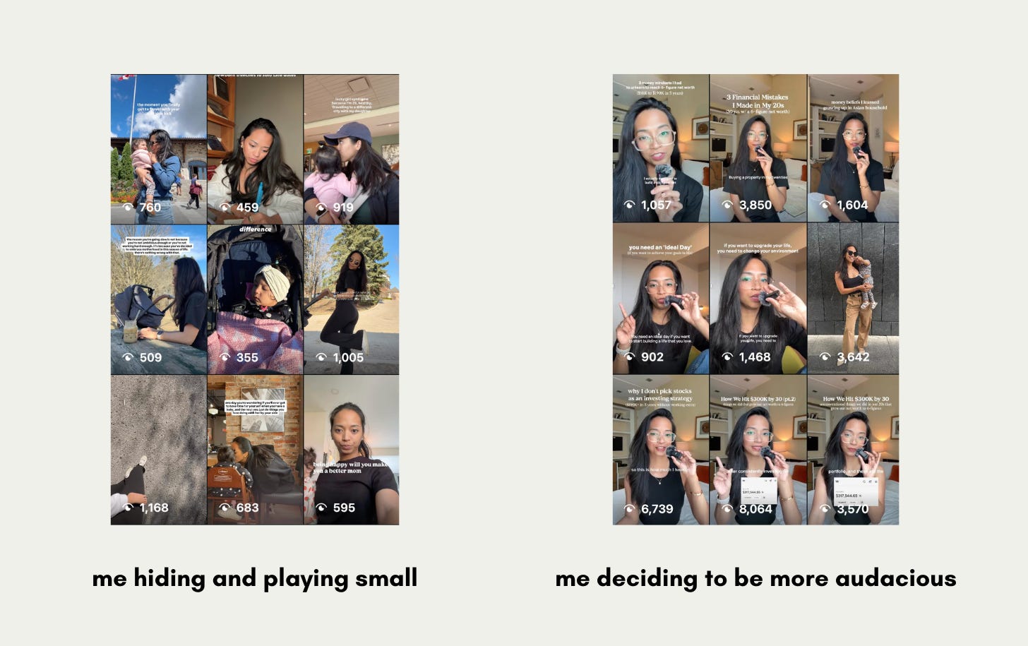 As a result, after all these years, I learned to hide and play small. I created trendy videos instead of publishing the real thoughts I have in my drafts. At the core of it, I didn’t have the audacity. Every time I see a creator who’s way more successful than I am, I think to myself, “Oh, they’re successful because they’re special.”